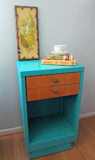 It has one dovetailed drawer with a large area underneath to store just about anything. The nightstand is solid wood. I hand painted it with two coats of paint, using Sherman-Williams paint color, Nifty Turquoise then protected it with polyurethane and wax. It is a groovy shade of blue, perfect for the retro lover. The drawer face also had a face lift. I sanded off the original finish, then hand rubbed it with six coats of Tung oil to bring out the grain and shine. I replaced to old ugly hardware with new hip pieces.